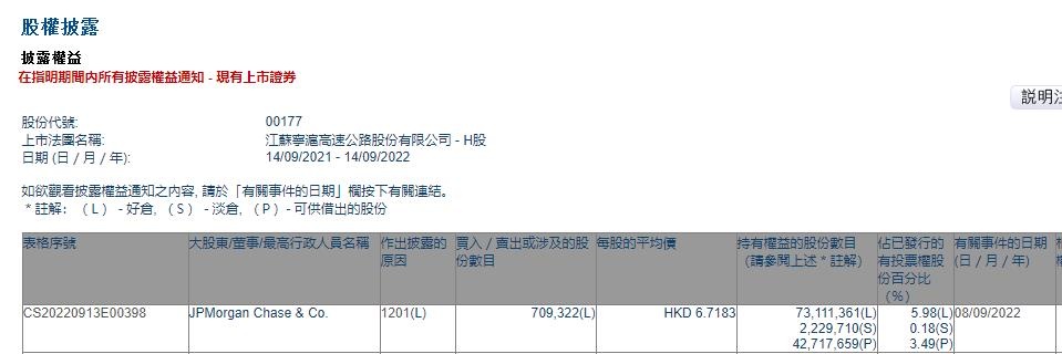 智通财经APP获悉,香港联交所最新资料显示,9月14日,小摩减持江苏宁沪高速公路(00177)70.9322万股,每股作价6.7183港元,总金额约为476.54万港元。增持后最新持股数目约为7311.14万股,最新持股比例为5.98%。