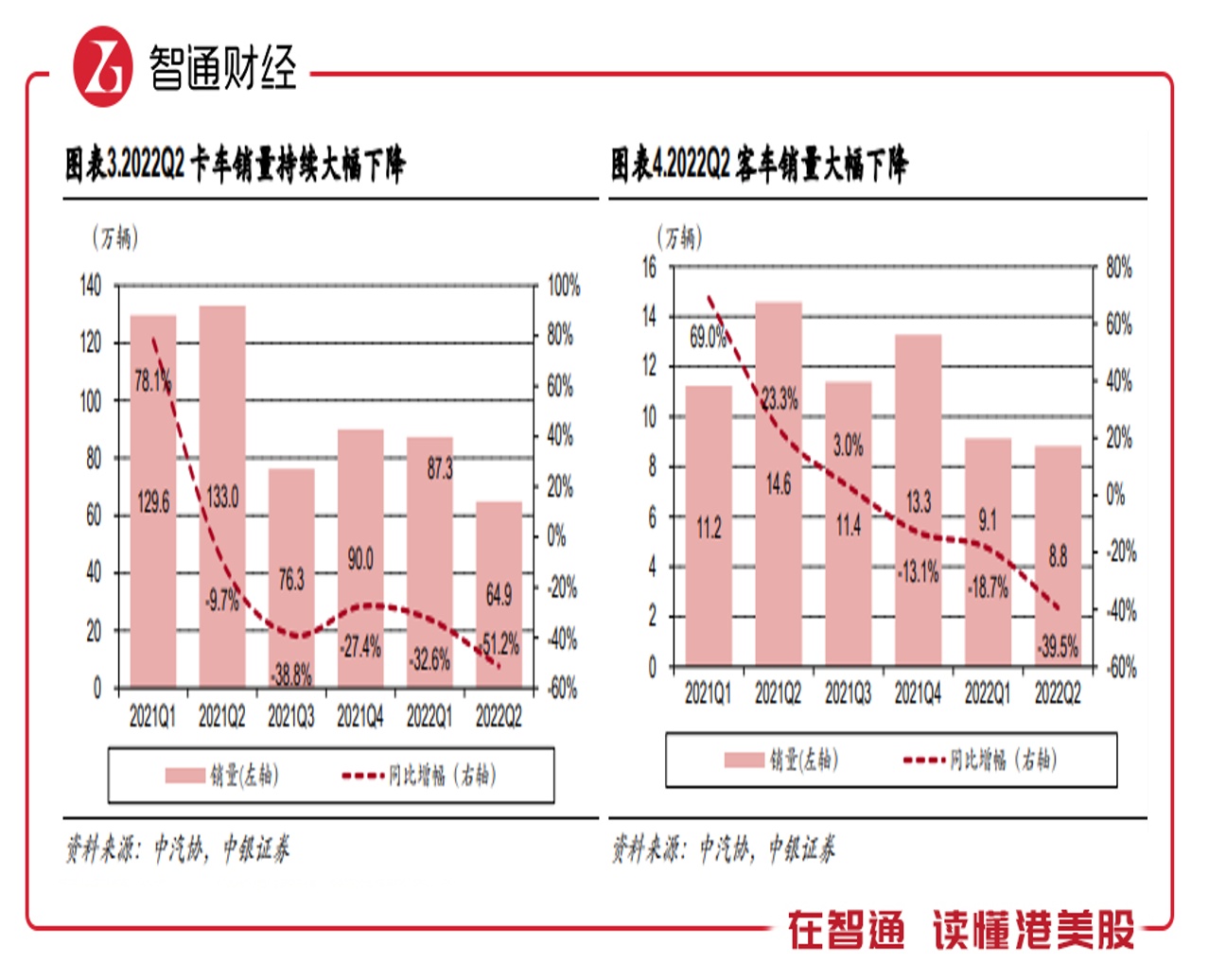 今年上半年,汽车整体销量下滑6.6%,其中商用车景气度持续低迷,销量下滑幅度高达41.2%,分类别看,卡车销量自去年Q3至今年Q2,平均下滑幅度超过30%,客车也于去年Q4以来维持双位数的下滑通道。因新能源车贡献,乘用车销量相对较好,今年Q2新能源车的渗透率已提升至24.2%。