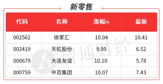 而防御类的大消费也是资金聚焦比较多的地方,中百集团(000759.SZ)没想到成了市场最高板,把天虹股份(002419.SZ)、老庄股徐家汇(002561.SZ)都带起。还有昨日提到的人人乐(002336.SZ)。