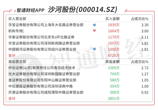 沙河股份(000014.SZ):多主力现身龙虎榜,机构席位买入1664万元,买一是知名游资的席位买入1811万元,买五是顶级游资赵老哥的席位买入1002万元,当日净买入3212万元,该股近期持续放量,预计走趋势为主。