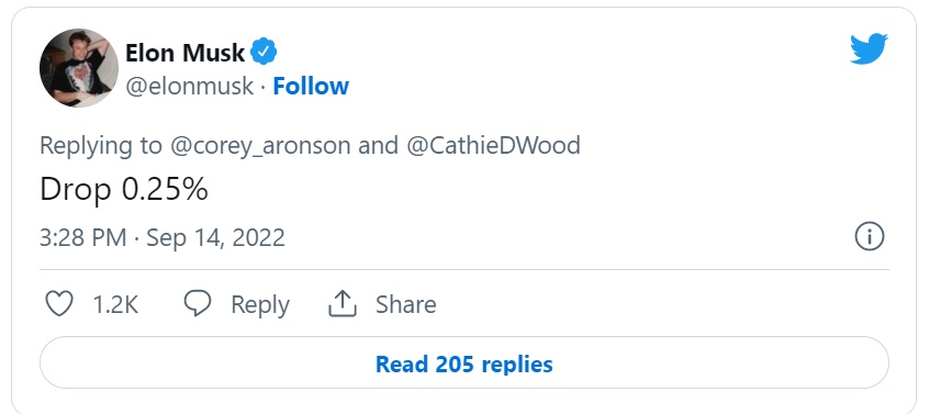 智通财经APP获悉,特斯拉(TSLA.US)首席执行官埃隆·马斯克(Elon Musk)发表推文称,建议美联储将利率下调25个基点。周二,马斯克就警告称,美联储大幅加息可能会带来通货紧缩的风险。