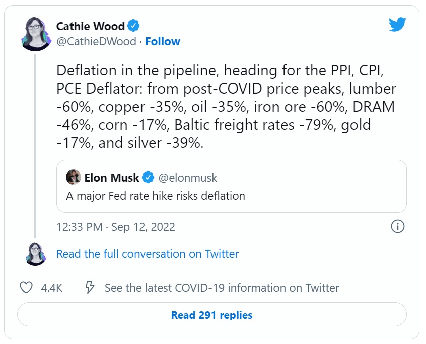 此前,木头姐就回应马斯克“大幅加息带来通缩风险”的推文称:“黄金和铜等领先的通胀指标如今显示出通缩的风险。即使是油价也已从高点下跌了35%以上,回撤了今年的大部分涨幅。通胀正在转变为通缩,最好的通胀指标之一——黄金价格在 2020 年 8 月达到 2075 美元的高点,如今已下跌了约 15%。木材价格下跌了 60% 以上,铜价下跌 30%,铁矿石下跌 60%。”