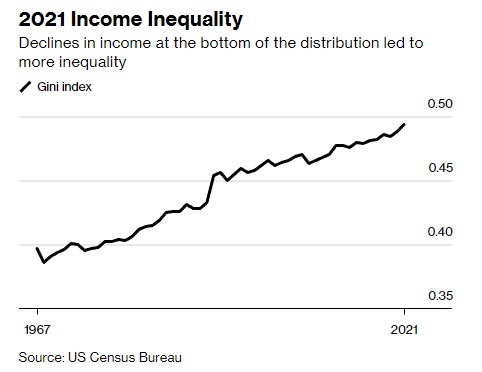 2021年,也就是拜登任期的第一年,衡量美国收入不平等的一项关键指标升至新高。