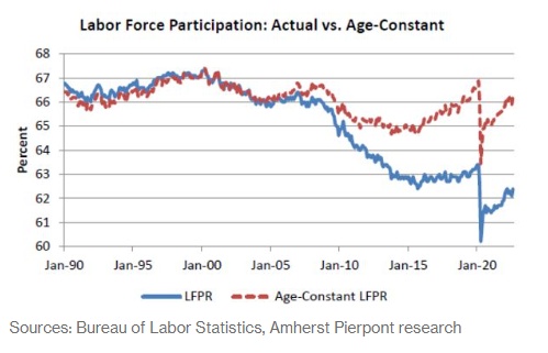 但Amherst Pierpont的首席经济学家斯蒂芬·斯坦利表示,目前的参与率仍比疫情前的水平低一个百分点,可能已经是正常水平,一旦考虑到老年人在人口中所占比例的增加,参与率显然与疫情前差不多。