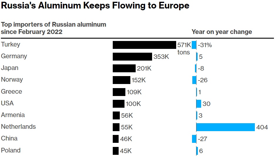 例如,挪威海德鲁公司不会同意使用任何新的俄罗斯金属。全球最大规模的铝金属买家之一诺贝丽斯宣布,欧洲工厂供应铝金属的潜在新交易中将拒绝俄罗斯的铝金属。挪威海德鲁公司挤压铝制品业务执行副总裁Paul Warton称:“2023年我们绝对不会从俄罗斯购买产品。我不知道这些物资现在会流向哪里——可能流向亚洲、土耳其和其他对俄罗斯物资没有采取强硬立场的地区。”