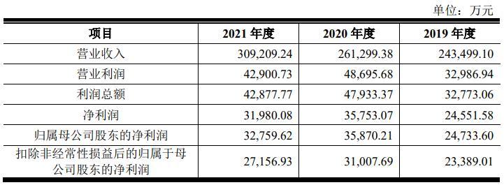 财务方面,于2019年度、2020年度及2021年度,公司营业收入约为24.35亿元、26.13亿元、30.92亿元;同期,公司归属母公司股东的净利润分别约为2.47亿元、3.59亿元、3.28亿元。