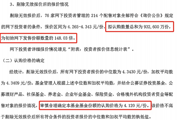 因有1家机构报价无效,因此,剔除无效报价后,76家网下投资者管理的214个配售对象全部符合《询价公告》规定的网下投资者的条件,拟认购数量总和为93.26亿份。
