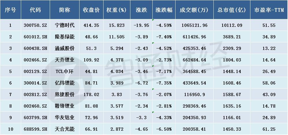 该指数大幅下跌的原因,与万亿“宁王”下挫有着不可分割的关系。宁德时代在8月24日-9月15日区间内跌幅达25.6%,9月14日盘中跌幅一度超6%。今日,宁德时代继续暴跌,盘中跌幅达5%,差点没能保住万亿市值。截止今日收盘,宁德时代总市值不断下跌,从8月24日的12788亿缩水至9月15日的10112亿,16个交易日市值蒸发近2500亿。其余权重股,隆基绿能、TCL中环、亿纬锂能等均有大幅下跌,今日跌幅均超7%。
