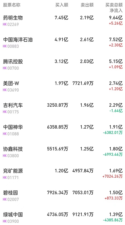 中海油(00883)获净买入2.4亿港元。消息面上,小摩发布研报称,中国海洋石油于9月13日斥逾1.49亿港元于联交所回购1493万股,每股平均回购价约10港元。该行预计中海油在未来三个月将持续购回H股,主因预测现价仅反映油价65美元/桶水平。该行维持中国海洋石油“增持”评级,目标价15港元。
