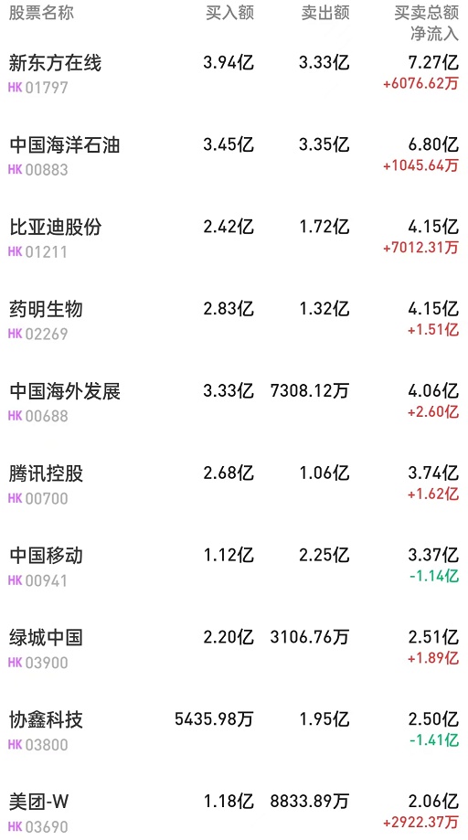此外,美团-W(03690)、比亚迪股份(01211)分别获净买入1.48亿、7012万港元。而中国移动(00941)遭净卖出1.13亿港元。