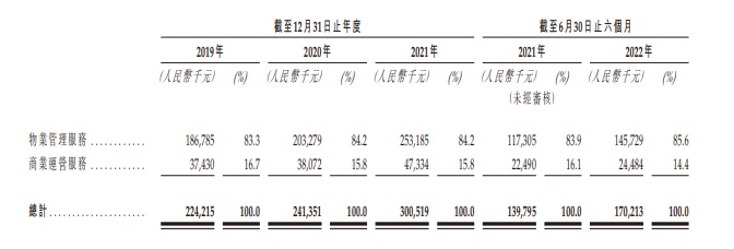 从收入结构来看,融汇悦生活超过80%的收入来自物业管理服务。报告期内,其物业管理服务业务线的收益分别为1.87亿元、2.03亿元与2.53亿元,分别占当期总收入的83.3%、84.2%和84.2%。