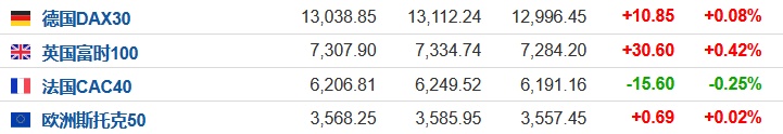 2. 截至发稿,德国DAX指数涨0.08%,英国富时100指数涨0.42%,法国CAC40指数跌0.25%,欧洲斯托克50指数涨0.02%。