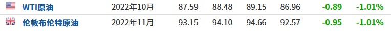 3. 截至发稿,WTI原油跌1.01%,报87.59美元/桶;布伦特原油跌1.01%,报93.15美元/桶。