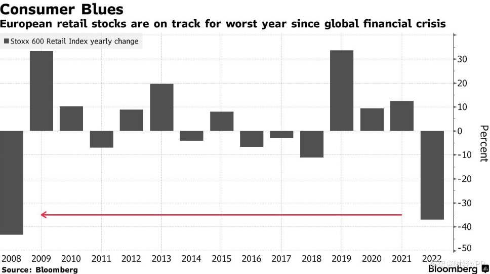然而,悲观情绪导致零售板块年内下跌37%,成为欧洲斯托克600指数今年表现最差的板块。