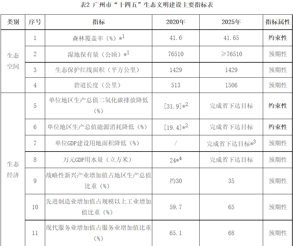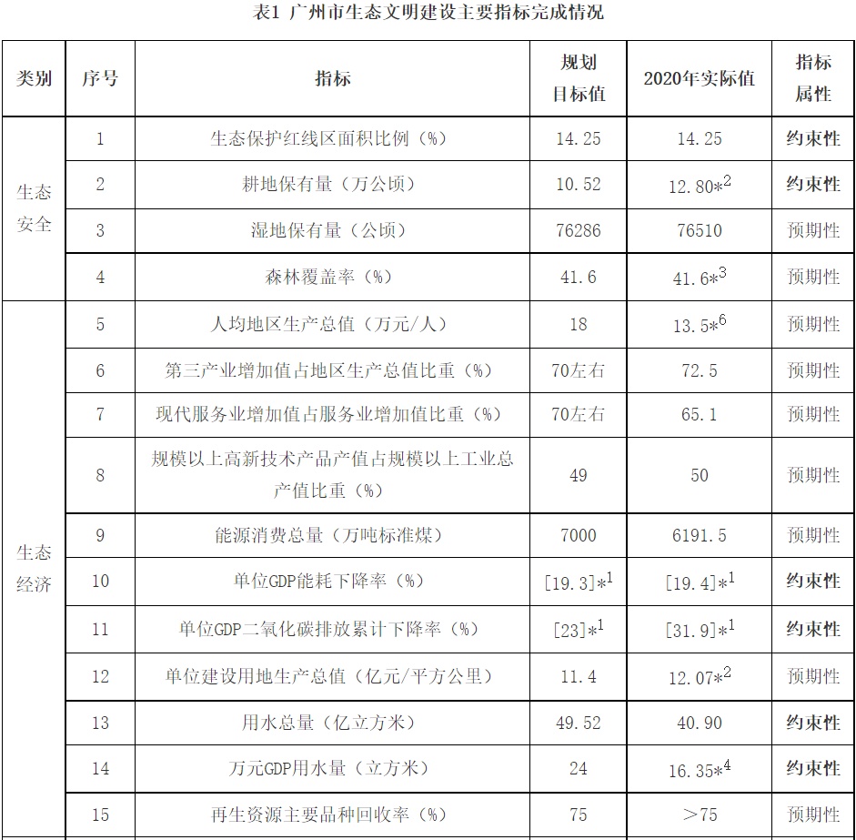 5.空气质量优良天数比率、城市声环境功能区夜间监测总点次达标率、城市再生水利用率等三项指标,因受新冠肺炎疫情影响,2020年指标数据偏高。按照《广州市国民经济和社会发展第十四个五年规划和2035年远景目标纲要》,到2025年,空气质量优良天数比率目标值为88%,城市声环境功能区夜间监测总点次达标率目标值定为80%;城市再生水利用率根据《广东省推进污水资源化利用实施方案》要求,2025年目标值定为25%。