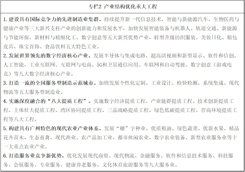 围绕南沙自贸区、中新广州知识城、空港经济区三个智造核心平台,布局优势产业集群,重点建设东翼、南翼、北翼三大产业集聚带,构建“一廊三芯、三带多集群”的空间结构,推进全市先进制造业集聚集群集约发展,形成若干个世界级先进制造业集群,发展壮大新一代信息技术、智能与新能源汽车、生物医药与健康、智能装备与机器人、轨道交通、新能源与节能环保、新材料与精细化工、数字创意等战略性新兴产业,优化提升汽车、电子、电力、石化等传统优势产业,推动制造业高端化、智能化、绿色化、服务化发展。发挥空港、海港、铁路港的辐射作用,带动周边区域发展枢纽经济,增强高端要素集聚配置能力,打造支撑畅通国内大循环、促进国内国际双循环的枢纽之城。立足区域资源禀赋、功能特色,支持重点产业平台创新发展、提升能级,加快建设价值创新园区,形成错位联动、多点支撑的发展格局。
