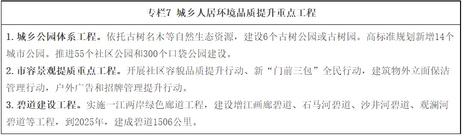 (三)美丽花城建设展现新面貌。大气环境质量稳步提升,水环境质量持续改善,城市黑臭水体基本消除,土壤环境安全得到有效保障,新污染物得到有效治理,环保基础设施短板弱项加快补齐,碧道建设稳步推进,农村人居环境得到全面改善。生态文明建设示范区建设有序推进。到2025年,空气质量优良天数比率达88%,城市集中式饮用水水源地水质达到或优于Ⅲ类比例达到100%,力争全市下辖区全部创建成国家生态文明建设示范区。