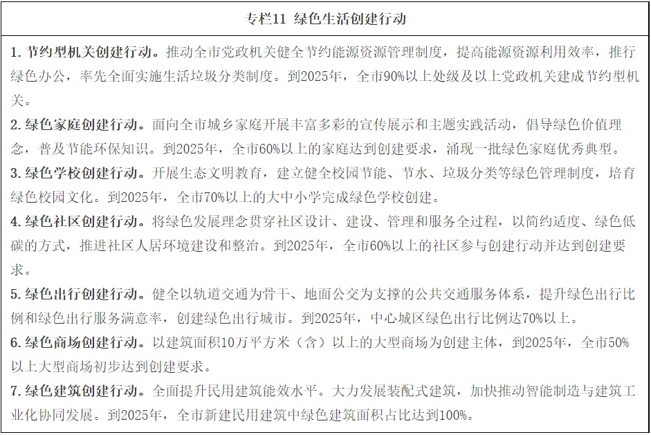 (六)绿色生活方式形成新风尚。尊重自然、顺应自然、保护自然的生态理念深入人心,简约适度、绿色低碳的生活方式和消费模式加快普及,文明健康的生活风尚初步形成,绿色生活创建行动成效突出,生活垃圾分类和塑料污染治理有序推进,全社会生态环保素养稳步提升。到2025年,公园绿地服务半径覆盖率达到85%,美丽宜居村占行政村比重为100%。