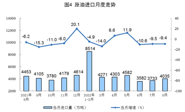 1—8月份,生产原油13694万吨,同比增长3.2%。进口原油33018万吨,同比下降4.7%。