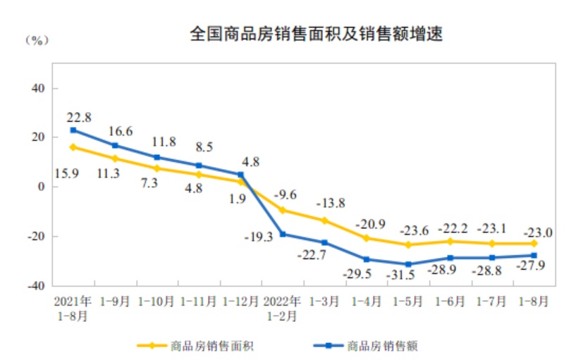 1—8月份,商品房销售面积87890万平方米,同比下降23.0%,其中住宅销售面积下降26.8%。商品房销售额85870亿元,下降27.9%,其中住宅销售额下降30.3%。