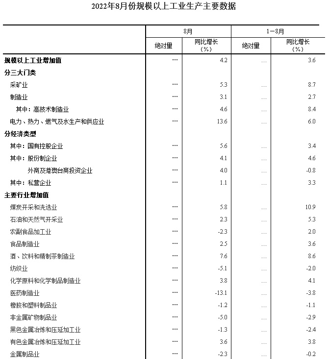 8月份,规模以上工业增加值同比实际增长4.2%(增加值增速均为扣除价格因素的实际增长率)。从环比看,8月份,规模以上工业增加值比上月增长0.32%。1—8月份,规模以上工业增加值同比增长3.6%。