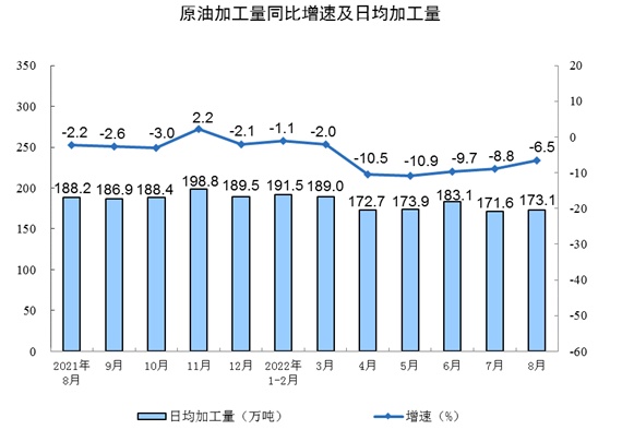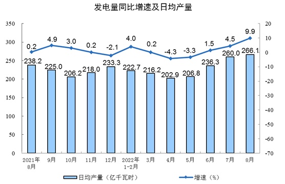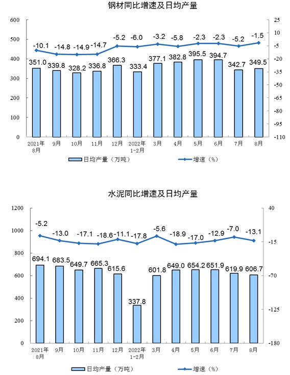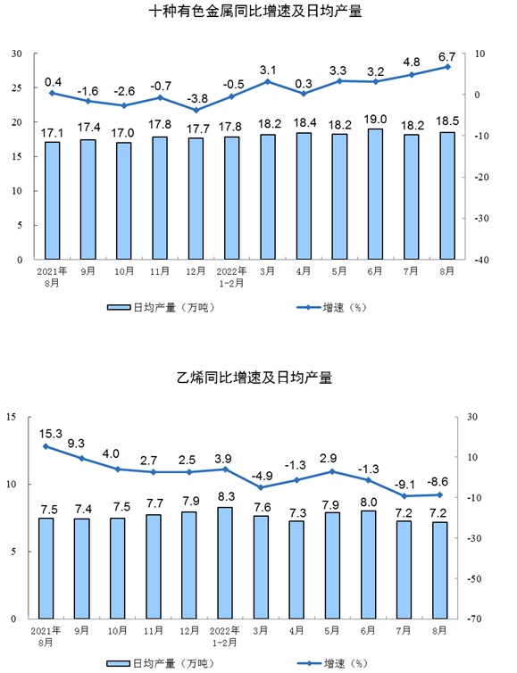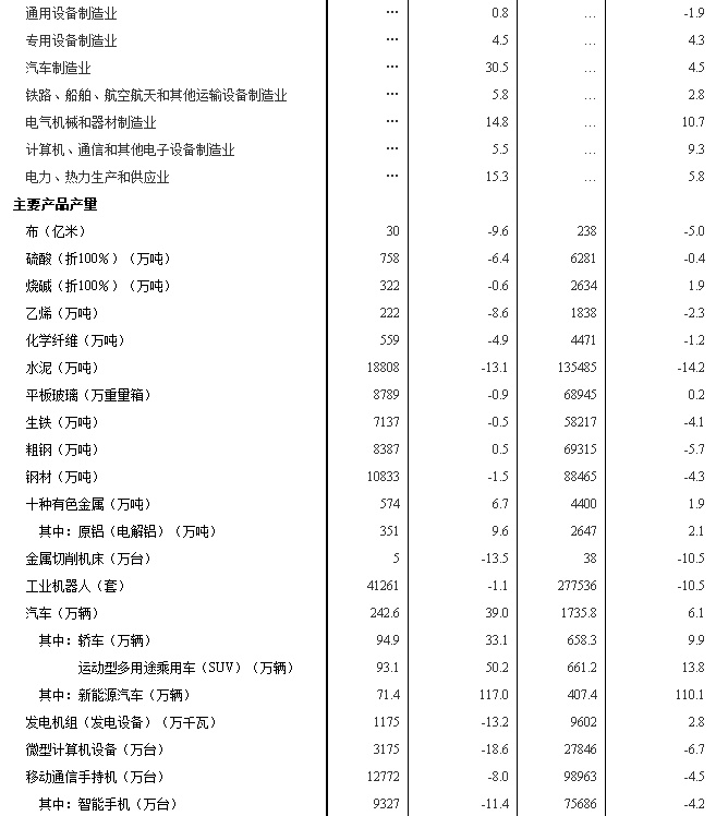 分产品看,8月份,617种产品中有250种产品产量同比增长。钢材10833万吨,同比下降1.5%;水泥18808万吨,下降13.1%;十种有色金属574万吨,增长6.7%;乙烯222万吨,下降8.6%;汽车242.6万辆,增长39.0%,其中新能源汽车71.4万辆,增长117.0%;发电量8248亿千瓦时,增长9.9%;原油加工量5366万吨,下降6.5%。