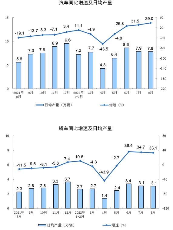 分行业看,8月份,41个大类行业中有24个行业增加值保持同比增长。其中煤炭开采和洗选业增长5.8%,石油和天然气开采业增长2.3%,农副食品加工业下降2.3%,酒、饮料和精制茶制造业增长7.6%,纺织业下降5.1%,化学原料和化学制品制造业增长3.8%,非金属矿物制品业下降5.0%,黑色金属冶炼和压延加工业下降1.3%,有色金属冶炼和压延加工业增长3.6%,通用设备制造业增长0.8%,专用设备制造业增长4.5%,汽车制造业增长30.5%,铁路、船舶、航空航天和其他运输设备制造业增长5.8%,电气机械和器材制造业增长14.8%,计算机、通信和其他电子设备制造业增长5.5%,电力、热力生产和供应业增长15.3%。