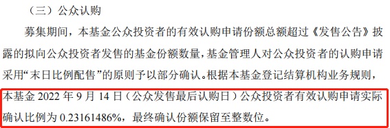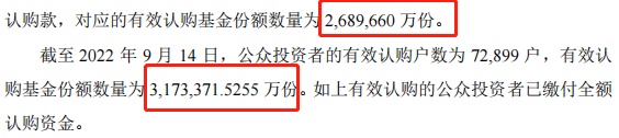 截至2022年9月14日,公众投资者的有效认购户数为7.29万户,有效认购基金份额数量为317.34亿份。其有效认购申请实际确认比例为0.23%。按照发售价格计算,基金公众发售部分比例配售前募集规模约为694.97亿元。
