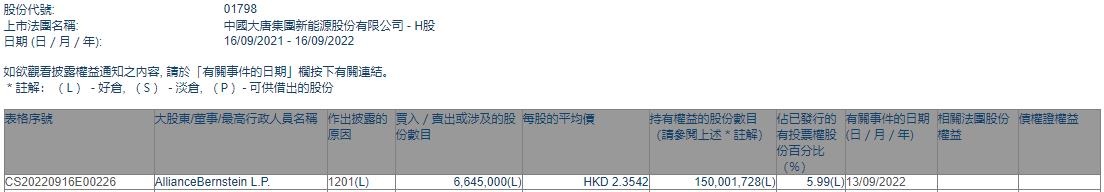 香港联交所最新资料显示,9月13日,AllianceBernstein L.P.减持大唐新能源(01798)664.5万股,每股作价2.3542港元,总金额约为1564.37万港元。减持后最新持股数目约为1.5亿股,最新持股比例为5.99%。