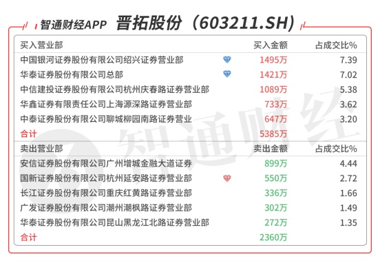 晋拓股份(603211.SH):多主力现身龙虎榜,机构席位买入1421万元,买一是顶级游资赵老哥的席位买入1495万元,买三是知名游资杭州帮的席位买入1089万元,当日净买入3025万元,该股今日突破60日线,预计压力位在前期缺口附近。