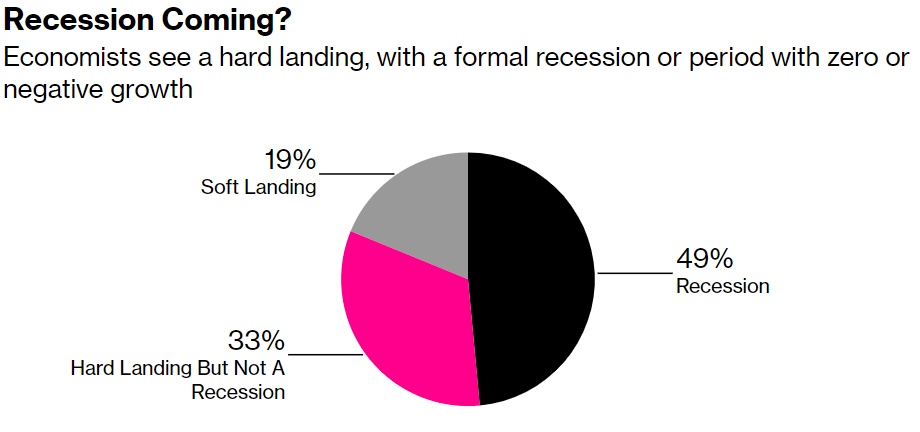 经济学家对美国经济前景的看法不一,49%的人认为未来两年可能出现衰退,33%的人认为未来一段时间可能出现零增长或负增长,其余的人则认为美联储将实现持续增长和低通胀的经济软着陆。