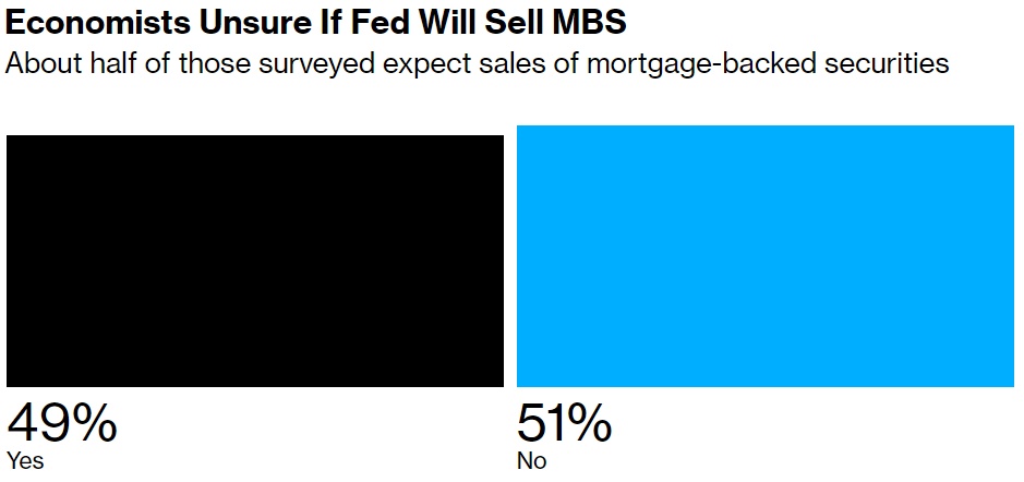 近一半的受访者表示,美联储官员们将诉诸于直接出售抵押贷款支持证券,这与他们表示的长期只持有美国国债的倾向一致。在那些预期出售的经济学家当中,关于何时开始出售的观点存在很大分歧,略占多数的人认为将在2023年第二季度开始出售。