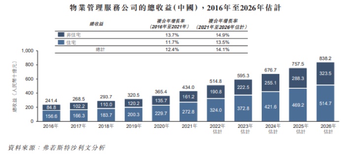 近年来,我国物业管理服务公司的在管总建筑面积稳步增长,由2016年的309亿平方米增加至2021年的372亿平方米,预计到2026年将进一步增长至447亿平方米。相对应的物业管理服务公司的总收益亦持续增长,由2414亿元增加至4340亿元,预计到2026年将达8382亿元。不过从国内物管的竞争格局来看,行业集中度不高,竞争格局高度分散且激烈。