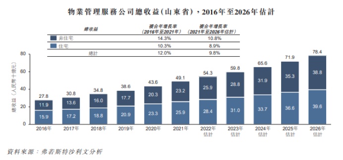 而业务集中在山东,公司未来增长空间就必定受到山东省物管市场发展的影响。据招股书显示,2021年全国非住宅物管公司的总收益为1612亿元,预计2026年达到3235亿元,复合年增长率14.9%。而2021年山东省非住宅物管公司的总收益为232亿元,预计2026年达到388亿元,复合年增长率约10.8%,而2016-2021年该增长率还为14.3%。可见在山东省物管行业中,非住宅板块的市场规模未来五年的增速不但远低于全国平均,还较过去五年为低。