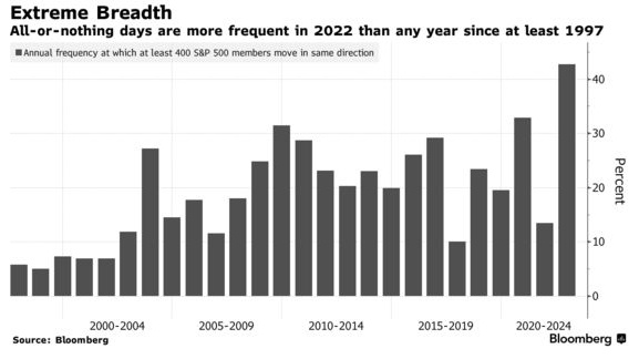 随着对通胀的恐慌和对经济能够经受住通胀的乐观情绪交替出现,股票集体在前一天上涨,后一天下跌的同步走势一直像风暴一样席卷市场。周二标普500指数成分股中有400多家公司的走势相同,这种情况在2022年已经重复了79次,如果这种速度持续下去,至少将是1997年以来的最高水平。