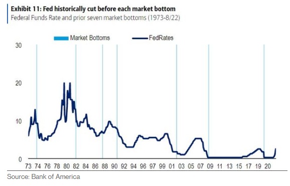 包括Savita Subramanian在内的美国银行策略师研究了此前的7次熊市,发现底部总是在美联储开始降息后出现——平均在首次收紧货币政策后11个月。换句话说,投资者最好等到央行转向鸽派立场后再出手。