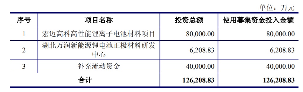 本次发行拟募集资金12.62亿元,其中计划投向宏迈高科高性能锂离子电池材料项目金额为8亿元,投入湖北万润新能源锂电池正极材料研发中心金额为6208.83万元,上述募集资金投向领域均属于科技创新领域,以及补充流动资金4亿元。