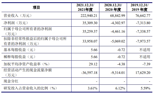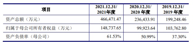 财务方面,于2019年度、2020年度及2021年度,公司营业收入分别约7.66亿元、6.88亿元、22.29亿元,资产负债率(母公司)分别为37.30%、50.99%、61.53%。