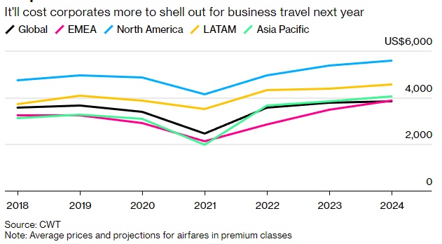 商务舱机票价格的飙升与通胀上升和对经济衰退的担忧同时发生。根据全球商务旅行协会的数据,商务旅行支出要到2026年才能回升至疫情前的1.4万亿美元,这比该协会此前预期的要晚两年。