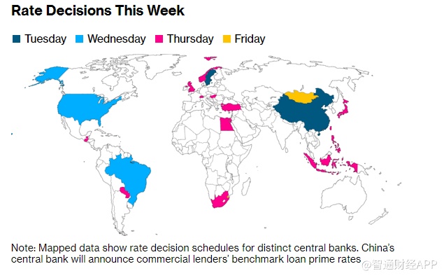 智通财经APP获悉,包括美联储在内的全球多家央行本周将陆续公布利率决议。预计全球主要央行本周累计加息超过500个基点,如果官员们选择更激进的举措,加息幅度可能会更大。