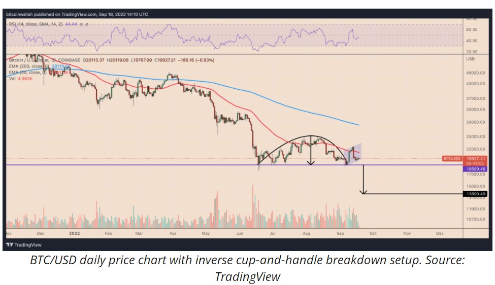 总体而言,9月18日的看涨/看跌期权平仓率为1.90,执行价为4.5万美元的看涨期权所占权重最大。但1万美元至2.3万美元的执行价格显示,每3个看涨期权至少对应4个看跌期权,这或许是对市场人气更现实的中期评估。从技术角度来看,比特币的价格可能会再下跌约30%,至1.35万美元,同时价格形成了一个令人信服的反向上行-通道。