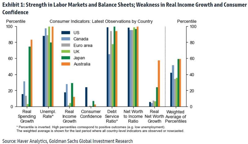 以Jan Hatzius为首的高盛分析师使用的一项衡量消费者健康状况的指标显示,这两个亚太地区国家的消费者健康水平在60%左右,而美国和欧元区分别在40%和35%左右。