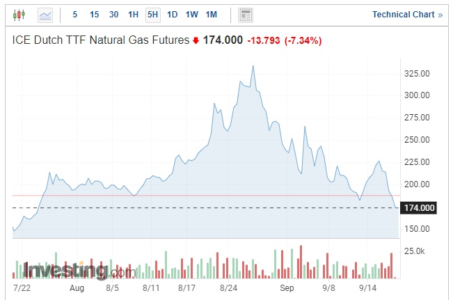 智通财经APP获悉,距供暖季开始不到两周,欧洲各国抓紧采取措施应对能源危机,推动欧洲天然气期货价格跌至近两个月来的最低水平。周一,欧洲基准荷兰近月天然气交易价格一度下跌8.3%,截至发稿,该期货下跌7.34%,报174欧元/兆瓦时。