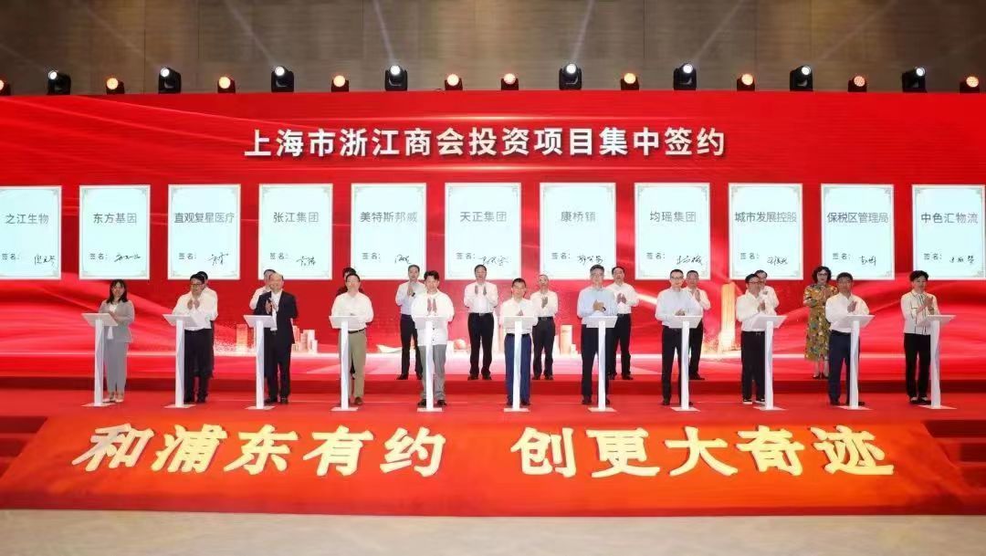 浦东新区副区长吴强,市工商联副主席、浦东新区区政协副主席、区工商联主席、格科微电子(上海)有限公司董事长赵立新,上海市浙江商会会长、均瑶集团董事长王均金,上海市浙江商会党委书记、万丰集团董事局主席陈爱莲等共同见证了民营企业投资项目集中签约。