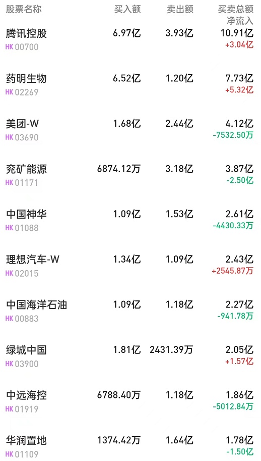 北水净买入最多的个股是腾讯(00700)、快手-W(01024)、药明生物(02269)。北水净卖出最多的个股是盈富基金(02800)、兖矿能源(01171)、华润置地(01109)。
