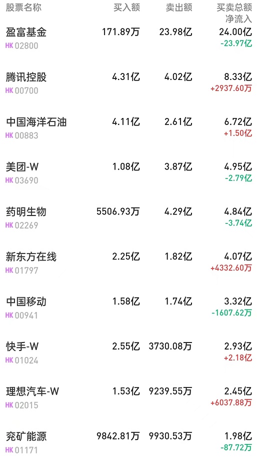 此外,快手-W(01024)、绿城中国(03900)、理想汽车-W(02015)分别获净买入2.17亿、1.56亿、8583万港元。而盈富基金(02800)、华润置地(01109)、中国移动(00941)分别遭净卖出23.96亿、1.5亿、1607万港元。
