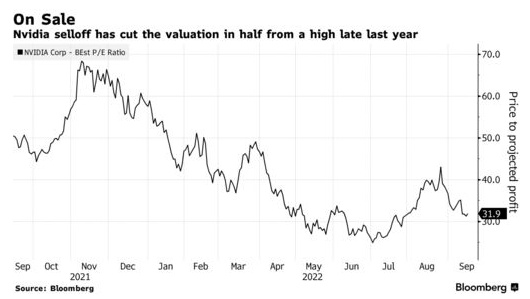 但年初至今,英伟达股价已暴跌55%,是市值超过1000亿美元的科技股中跌幅最大的,相比之下,该股市值曾在去年一度攀升至1万亿美元。另外,目前该股的市盈率仍达到32倍,高于过去十年的平均水平。