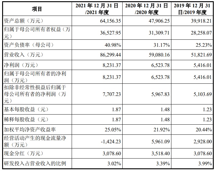 财务方面,唯特偶于2019年度、2020年度及2021年度,实现营业收入分别为5.18亿元、5.91亿元及8.63亿元,净利润分别为5416.01万元、6523.78万元、8231.37万元。同期,研发投入占营业收入的比例分别为3.99%、3.39%、3.02%。
