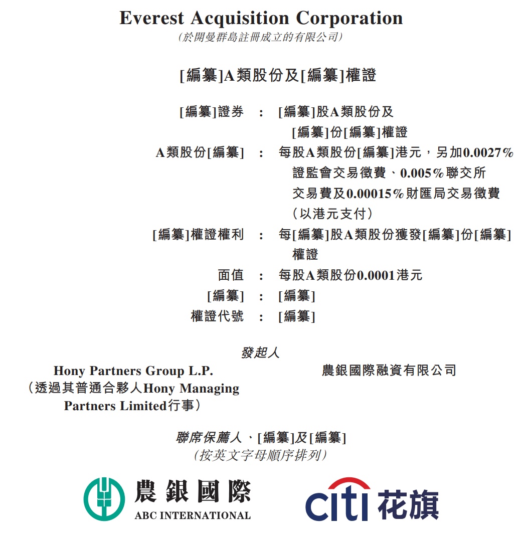 Everest Acquisition Corporation为一家新注册成立为开曼群岛获豁免公司的特殊目的收购公司,旨在与一项或多项业务进行合并、股份交换、资产收购、股份购买、重组或类似的业务合并。截至目前,公司尚未选择任何特定的特殊目的收购公司并购交易目标,公司概无,也无任何人代表公司就与公司进行特殊目的收购公司并购交易与任何特殊目的收购公司并购交易目标直接或间接展开或进行任何实质性讨论。