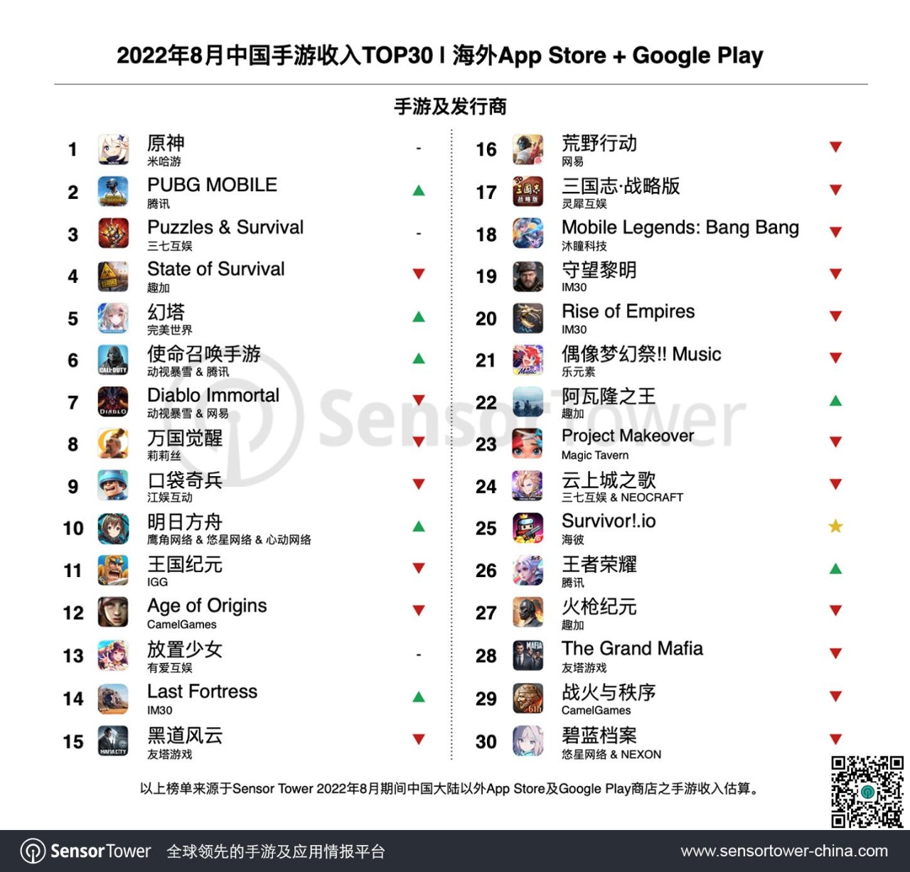 受日服版本2.5周年庆典活动的影响,《明日方舟》在日本市场热度不减,在7月海外收入环比激增187%的基础上,8月收入再度增长71%,排名上升13位至收入榜第10名,并跻身本期收入增长榜第4名。